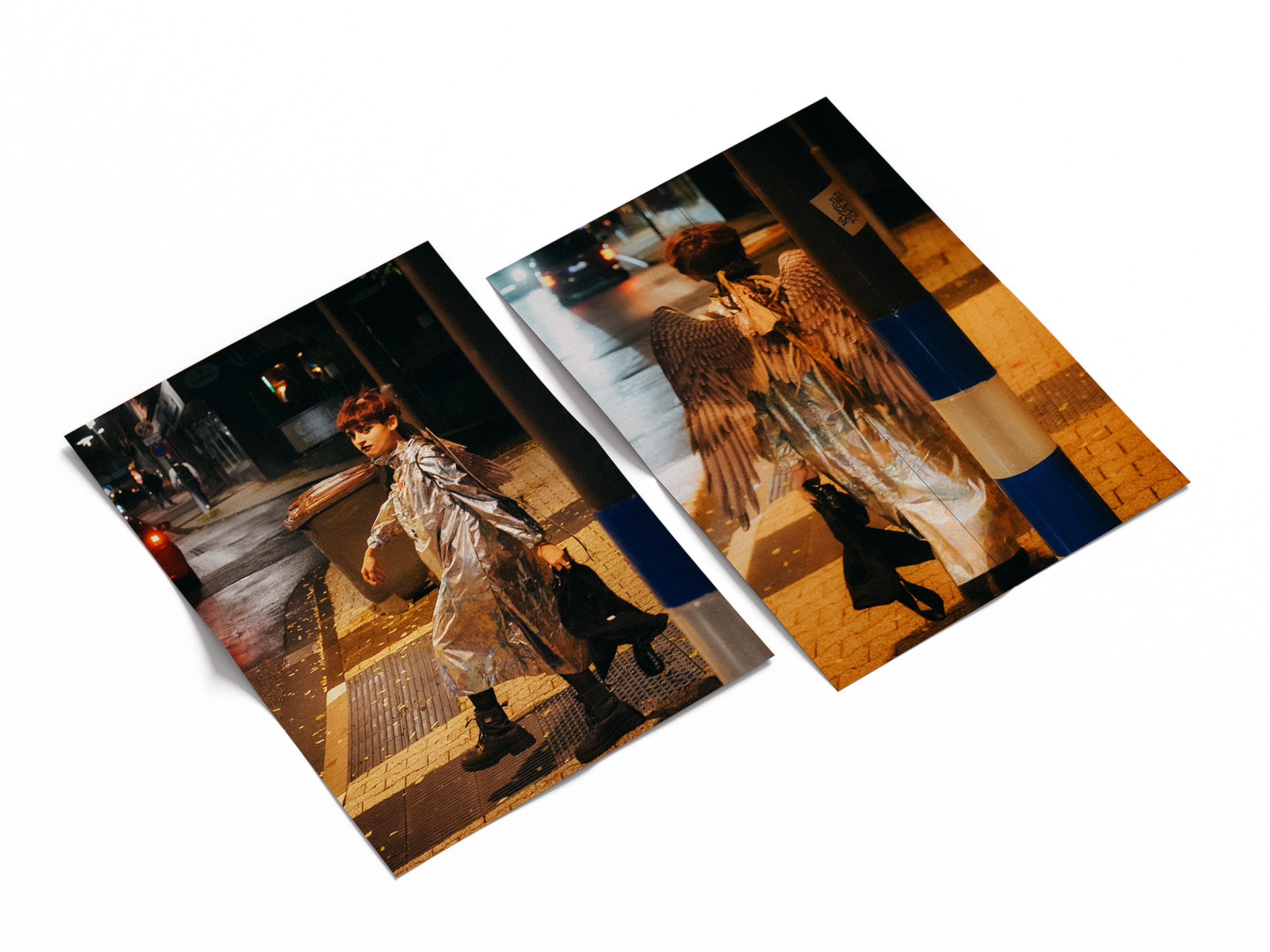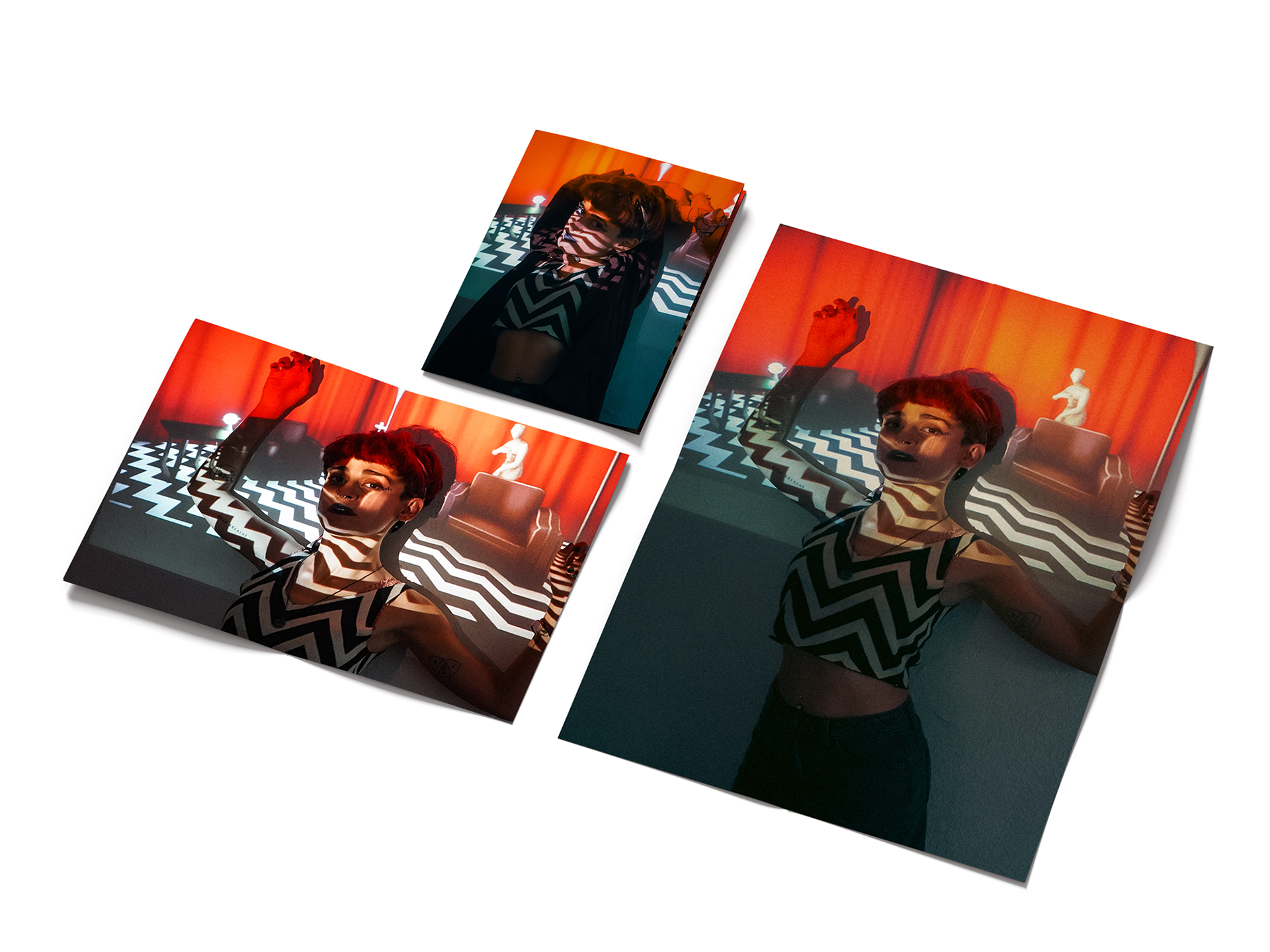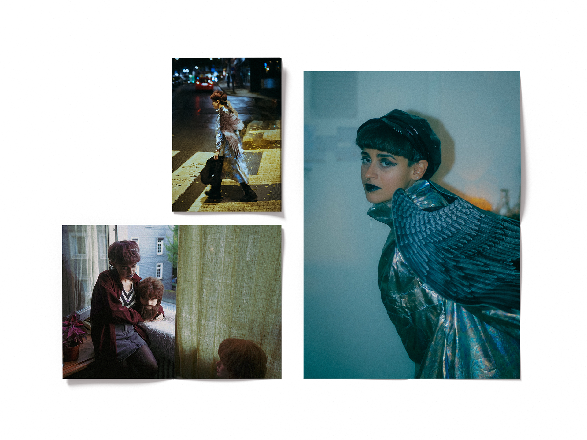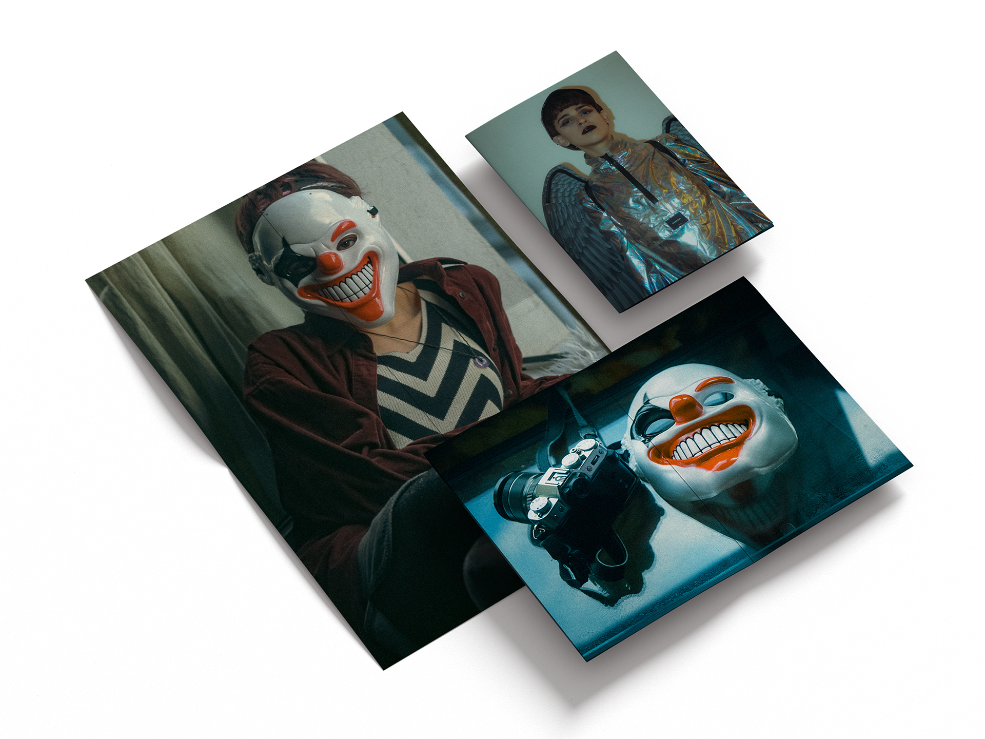 We see the self: patterned by light, hidden by a laugh, and costumed for an escape. The recurring chevron acts as a visual trap—a symbol of the relentless, repeating patterns of thought and anxiety. The masks and costumes, from the surreal clown to the metallic wing, are tools used to expose a deeper, less polished identity beneath the surface. Photography credits: Lia Tee (@lia_tee_images)